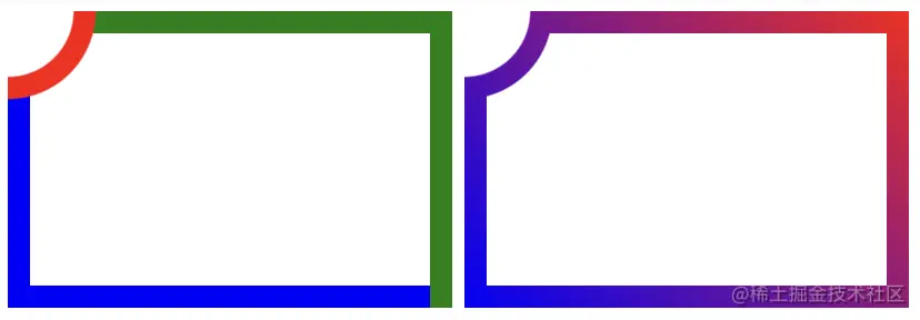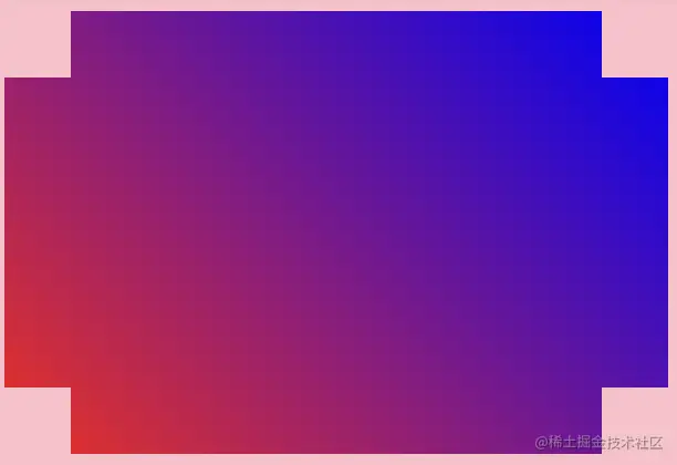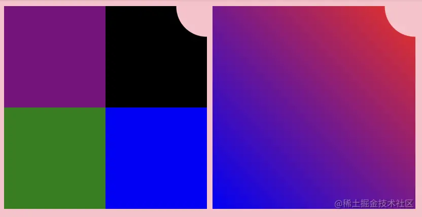conic-gradient()会覆盖radial-gradient(),这样就不会有切角。让我们将conic-gradient()中的一种颜色更改为透明。例如,将右上角改为透明,就是下面的效果:
