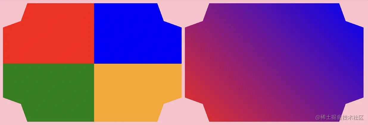 只有一个渐变的其他方法呢?我们需要使用另一个渐变!这两种方法只使用一个radial-gradient()来切割角落,因此我们将依靠另一个渐变来“隐藏”切割。我们可以使用带有四个部分的conic-gradient()来完成此效果: