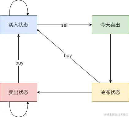 其实本题很多同学搞的比较懵,是因为出现冷冻期之后,状态其实是比较复杂度,例如今天买入股票、今天卖出股票、今天是冷冻期,都是不能操作股票的。 具体可以区分出如下四个状态: