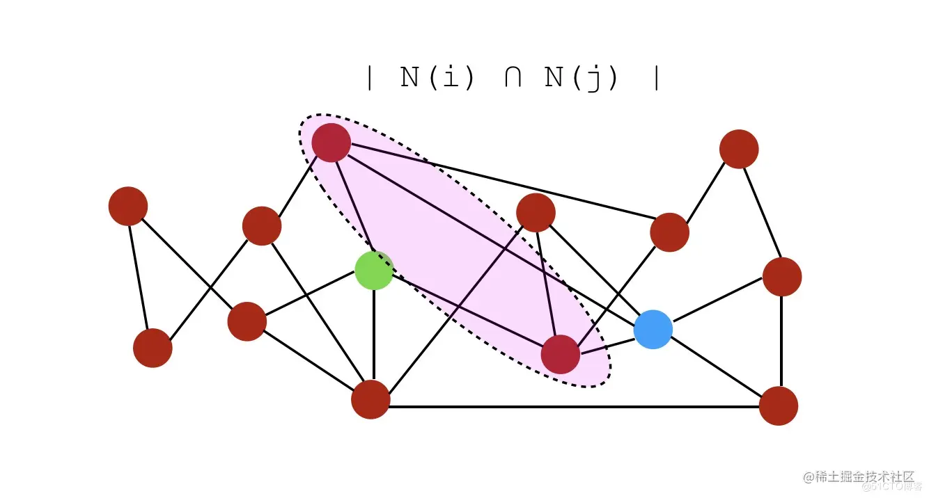 - 公共邻居:,即公共邻居的数量。在此示例中,分数将为2,因为它们仅共享2个公共邻居。