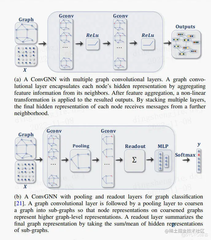 卷积图神经网络 (ConvGNNs) 将卷积操作从网格数据推广到图数据。 主要思想是通过聚合它自己的特征 xv 和邻居的特征 xu 来生成节点 v 的表示,其中 u ∈ N(v)。 与 RecGNN 不同,ConvGNN 堆叠多个图卷积层以提取高级节点表示。 ConvGNN 在构建许多其他复杂的 GNN 模型中发挥着核心作用。 图 2a 显示了用于节点分类的 ConvGNN。 图 2b 展示了用于图分类的 ConvGNN。
