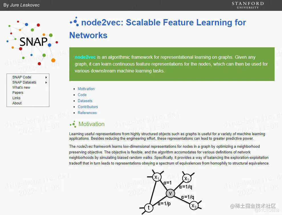 我们首先关注的是图组件的嵌入。有几种方法可以对节点或边进行嵌入。例如,DeepWalk【www.perozzi.net/projects/de… 】 使用短随机游走来学习图中边的表示。我们将讨论Node2Vec,这篇论文由2016年斯坦福大学的Aditya Grover和Jure Leskovec发表。