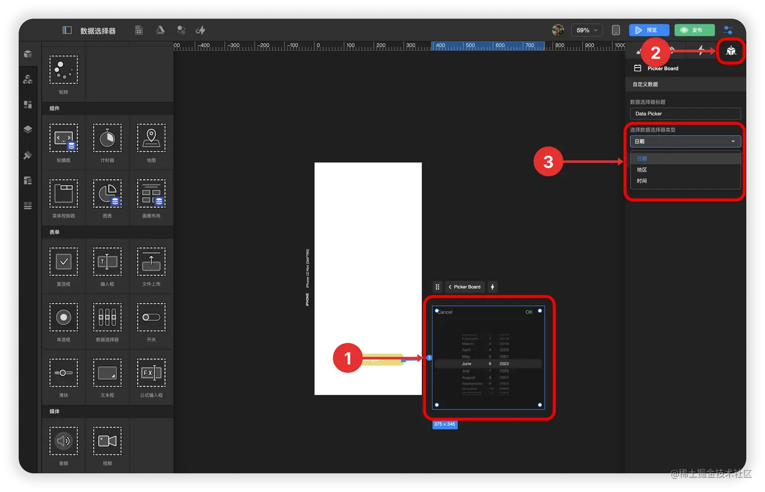 如何使用数据选择器配置日期筛选框? TOWIFY 2022-11-11 124 阅读1分钟 通过使用数据选择器组件实现一个日期选择器弹出功能。 效果展示 具体步骤 1. 添加数据选择器 2. 选择数据选择器类型 步骤分解 1.添加数据选择器 1.1. 拖拽 数据选择器 到 根容器 2.选择数据选择器类型 2.1. 选中 数据选择器面板 2.2. 点击 检查面板 中的 数据绑定与设置 2.3. 选择 日期 这样就可以使用数据选择器配置日期筛选框了。