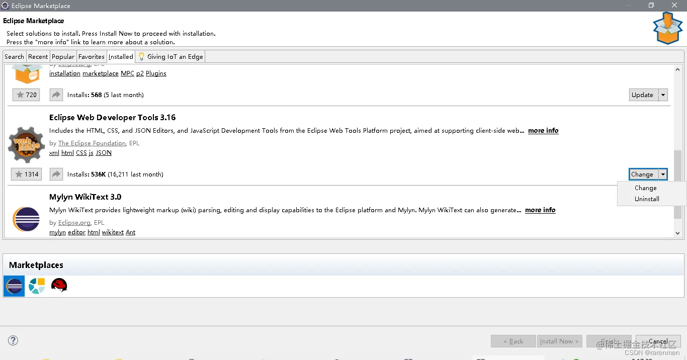 先试试Change吧,卸载重装的话,怕丢失了服务器的配置信息,重新弄起来更加麻烦。更何况,EWDT和日食有没有版本对应关系还不确定呢。原来这里只能算是“添加/删除组件”,不能升级。反复操作了几次,剩下了这一个组件一直没安装上。