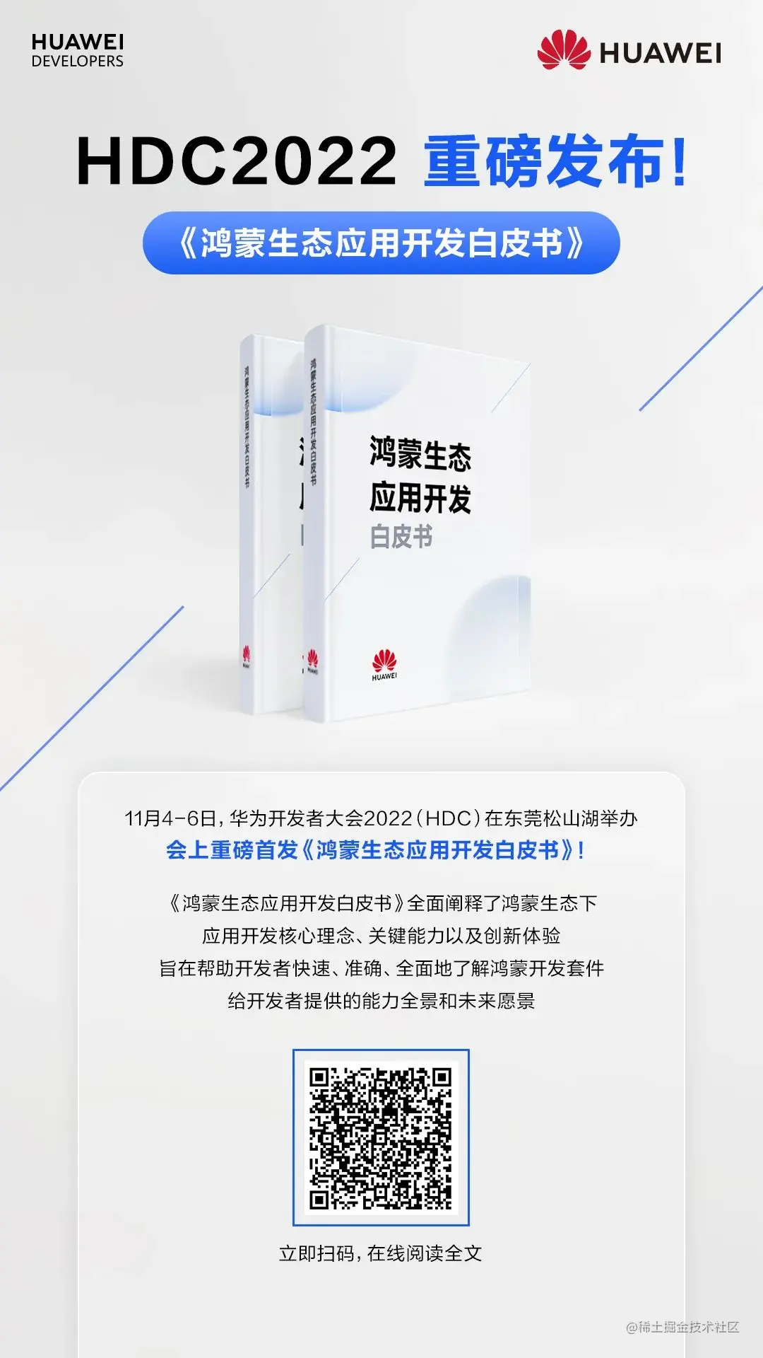首版《鸿蒙生态应用开发白皮书》携万众瞩目,重磅而至!点开下图扫码即可在线阅读《白皮书》 全文!