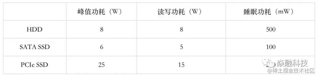 关于功耗,业界定义可以分为峰值功耗(Peak Power)、读写功耗(Active Power)、睡眠功耗(Sleep Power)这几类。HDD 与 SSD的功耗如下表所示: