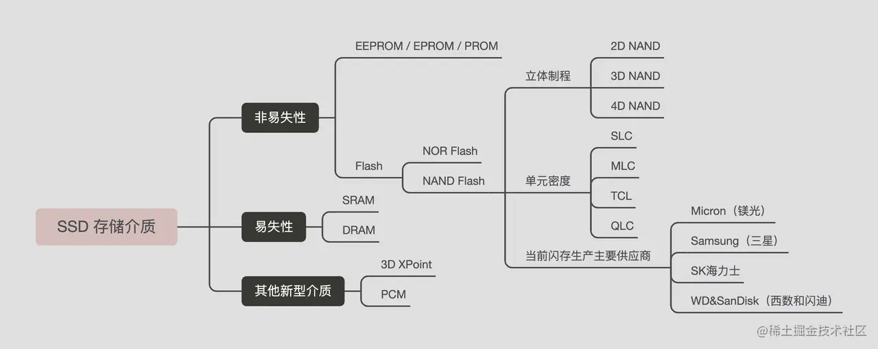目前主流的 SSD 使用闪存(Flash)作为存储介质。Flash 技术分为 NAND Flash 和 NOR Flash 两种。NOR Flash 传输效率很高,但写入和擦除速度很慢,容量也较小,一般为 1Mb-2Gb,常用于保存代码和关键数据。而 NAND Flash 能提供极高的单元密度,可达到高存储密度,适用于大量数据的存储。NAND Flash 具有写入、擦除速度快、存储密度高、容量大的特点,也因此迅速成为了 Flash 主流技术。除了 NAND Flash,现在还有 3D XPoint 等新型的 SSD 存储介质,比如:傲腾 SSD 等。NAND Flash SSD 的立体制程经历了从 2D NAND 发展到了4D NAND 的大发展,趋势是硅片单位面积能设计生产出更多的比特(bit),使得每 GB 成本更低。按存储单元密度来分,NAND Flash 可分为 SLC、MLC、TLC、QLC 等,对应 1 个存储单元分别可存放 1、2、3、4bit 的数据。目前 NAND Flash 主要以 TLC 为主,不过 QLC 的比重正在逐步提高,很多知名存储厂商都推出了基于 QLC SSD 的全闪存储产品。