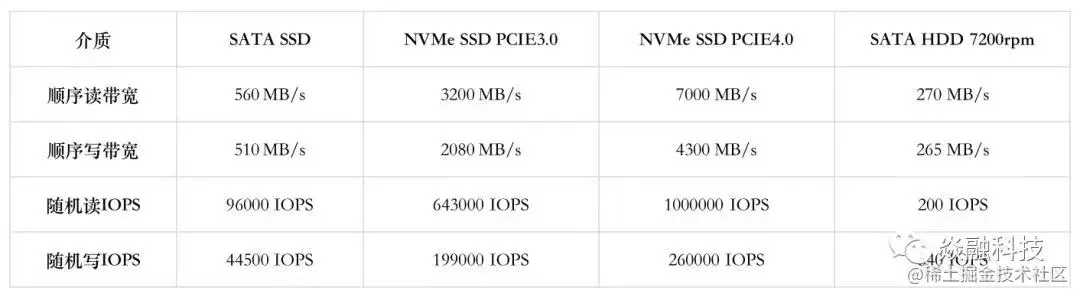 下表列举了各类主流 SSD 和 HDD 的性能数据对比: