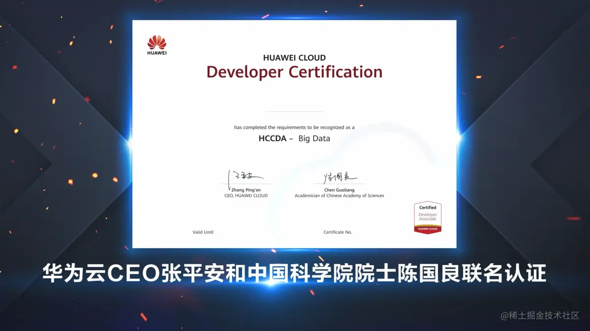 同时会上,华为云与中科院院士陈国良共同发布了“大数据入门级开发者认证联名认证证书”,该认证由华为云学堂联合教育部数据科学群虚拟教研室重磅打造。