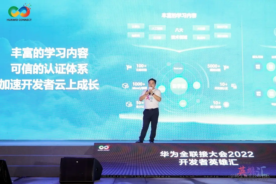 2022年11月7日-9日,华为全联接大会2022在深圳和线上举办。在“华为开发者英雄汇”主题活动上,华为云开发者联盟产品部和云应用商店部长王希海发表了“生于云,长于云,让开发者成为决定性力量”的主题演讲,重点提到了:华为云学堂为开发者提供丰富的学习内容,并打造可信认证体系,加速开发者成长。