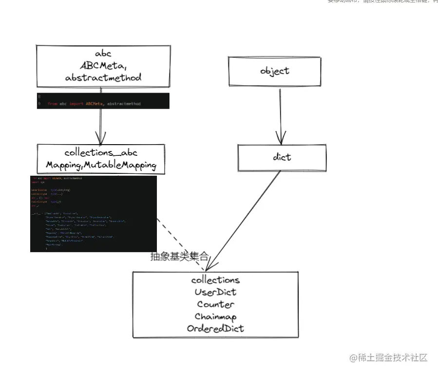 实例化映射方法,一般不会直接继承collections.abc抽象基类的,而是是继承Python内置的dict类对象或者collections.UserDict进行拓展。抽象基类作为一个定义映射关系的基本接口。 同时也可以对isinstance来判断该接口是不是映射类型。