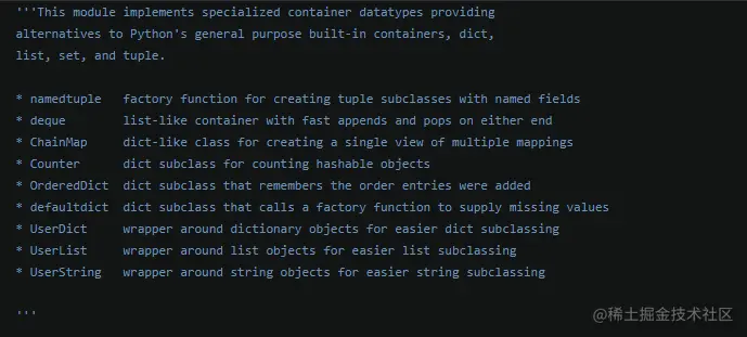 Collections 模块提供多种场景的集合类型,在特定场景下,使用它内部的方法可以提高我们代码的运行效率。 collections 模块文档介绍,已经实现对Python 内置数据类型 list,set,tuple和dict都实现的了拓展。
