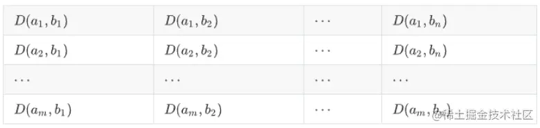 然后用欧式距离计算出每序列的每两点之间的距离,D(ai,bj) 其中1≤i≤m,1≤j≤n