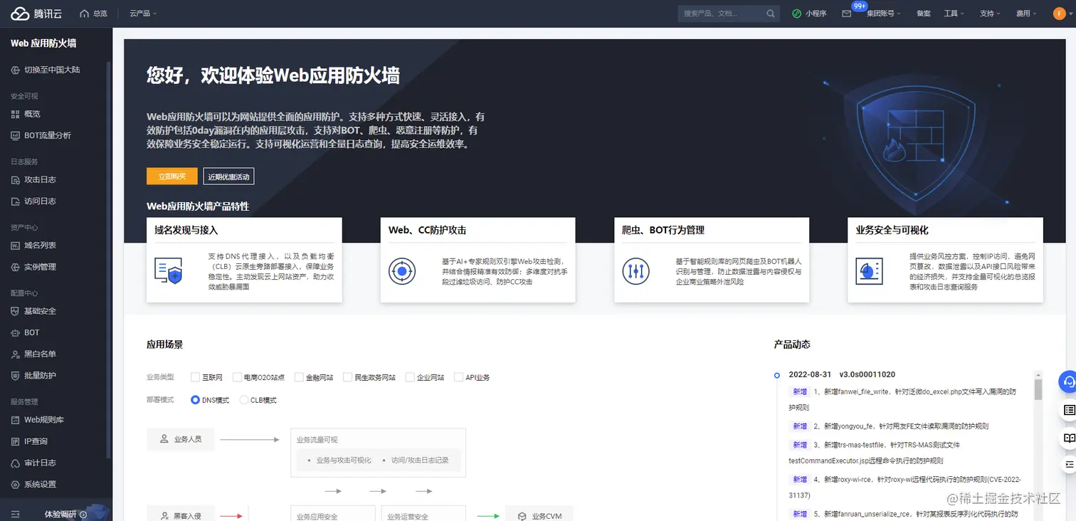 下面我们直接开始操作腾讯云T-Sec Web应用防火墙。
