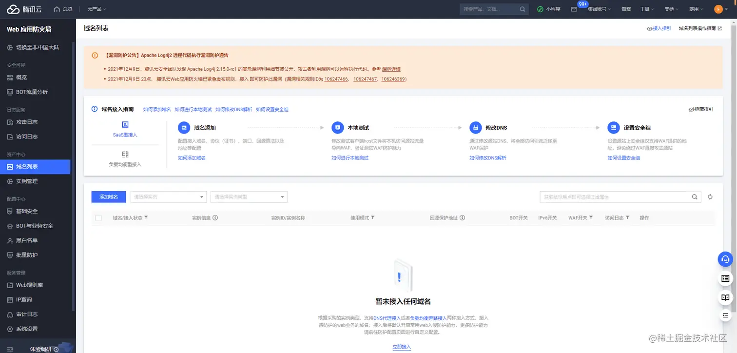 购买T-Sec Web应用防火墙后,我们访问网址https://console.cloud.tencent.com/guanjia,进入“Web应用防火墙”页面:
