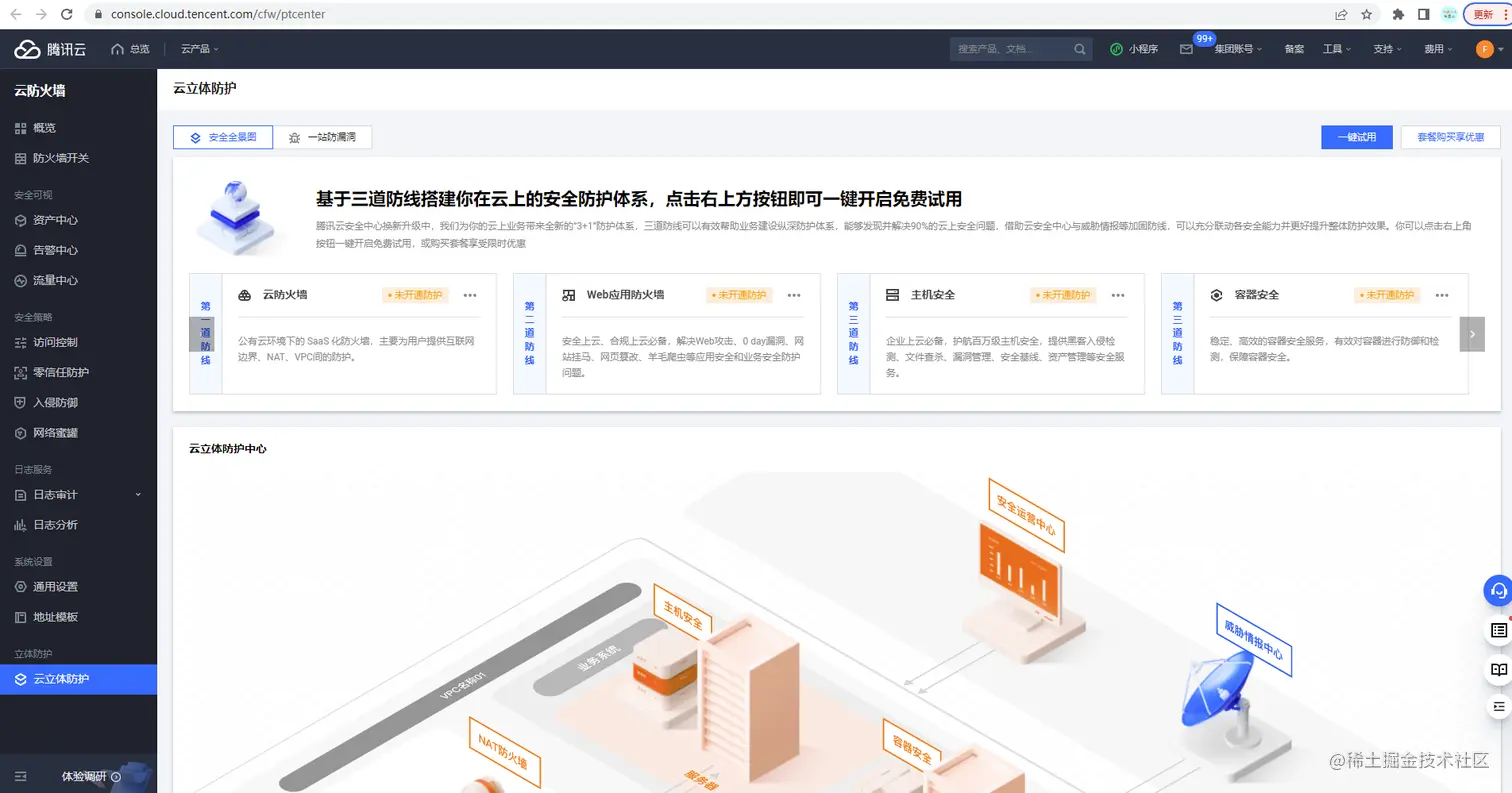 访问网址https://console.cloud.tencent.com/cfw/ptcenter,进入“云立体防护”页面: