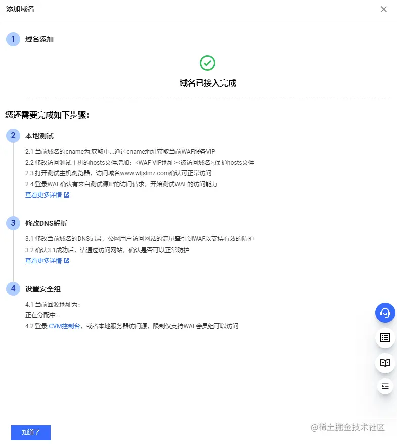 点击【确定】按钮后,会显示“域名已接入完成”: