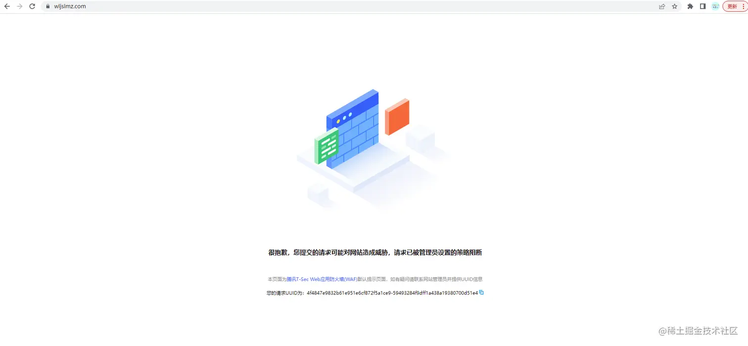 可以看到页面被阻断,说明腾讯云的web防火墙的黑名单功能生效了!