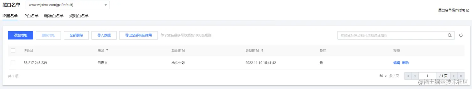 点击黑名单后,在“IP黑名单”列表就看到了刚刚添加的ip地址: