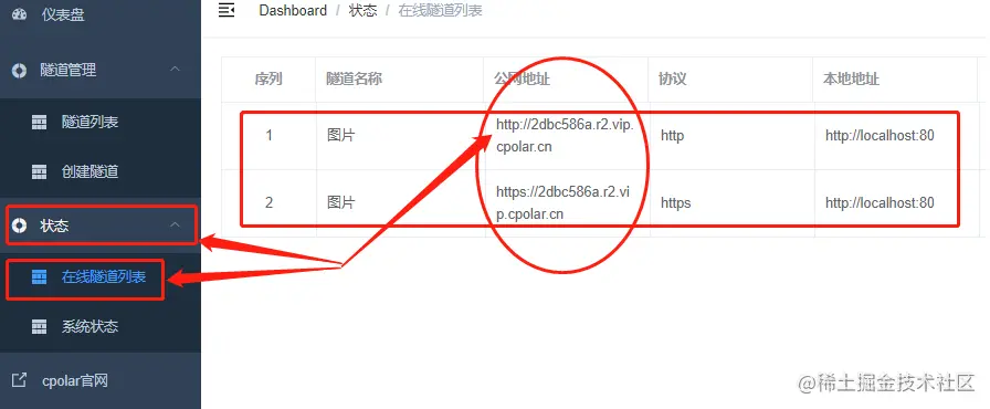完成设置后,我们点击页面下方的“创建”按钮,生成一条能从公共互联网指向本地Piwigo网站的内网穿透数据隧道。这条隧道的出口是本地piwigo网页,而入口我们可以在cpolar左侧“状态”项下的“在线隧道列表”中找到。