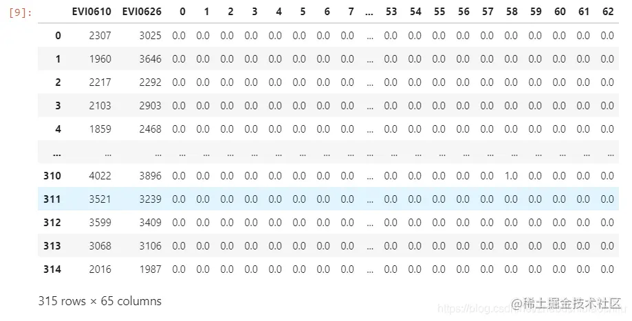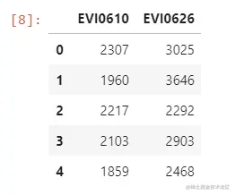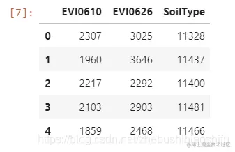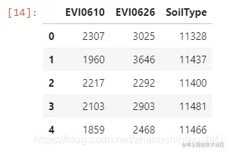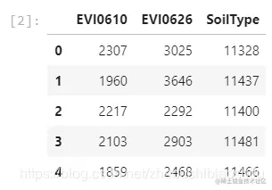 数据前五行展示如下图。其中,前两列'EVI0610'与'EVI0626'为数值型连续变量,而'SoilType'为数值型类别变量。我们要做的,也就是将第三列'SoilType'进行独热编码。