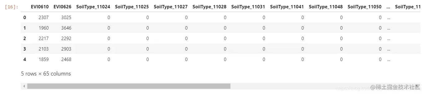 最终结果中,列名称可以说是非常醒目,同时,共有65列数据,自动删除了原本的'SoilType'列,实现了“独热编码”“新列重命名”与“原始列删除”,可谓一举三得,简直是太方便啦~