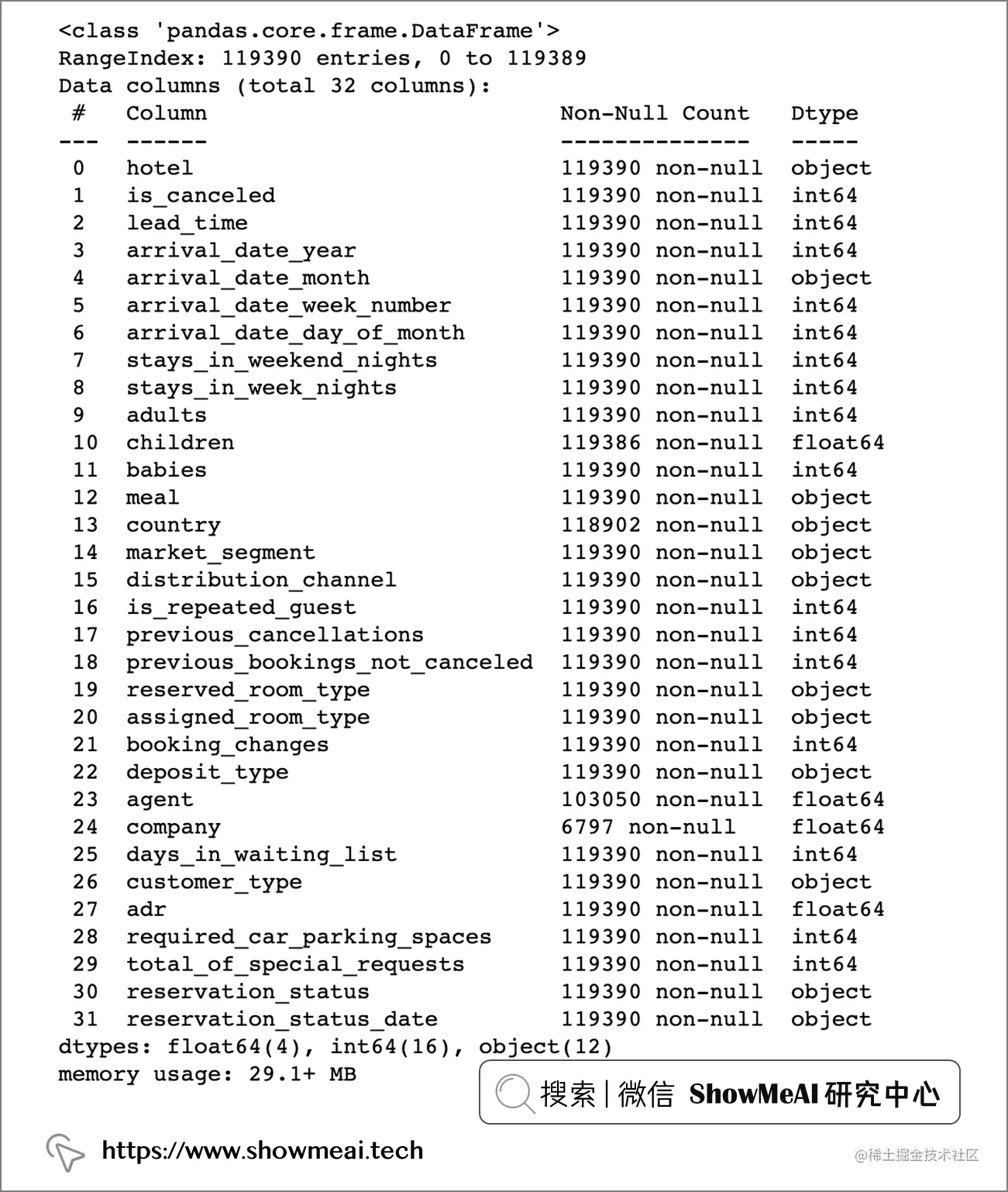 我们本次用到的是 🏆酒店预订数据集,包含 119390 位客人,有 32 个特征字段,大家可以通过 ShowMeAI 的百度网盘地址下载。