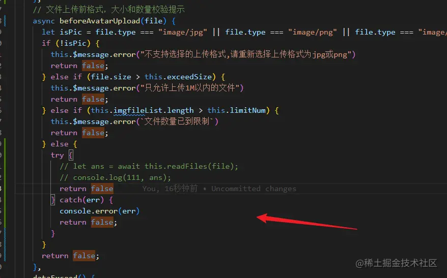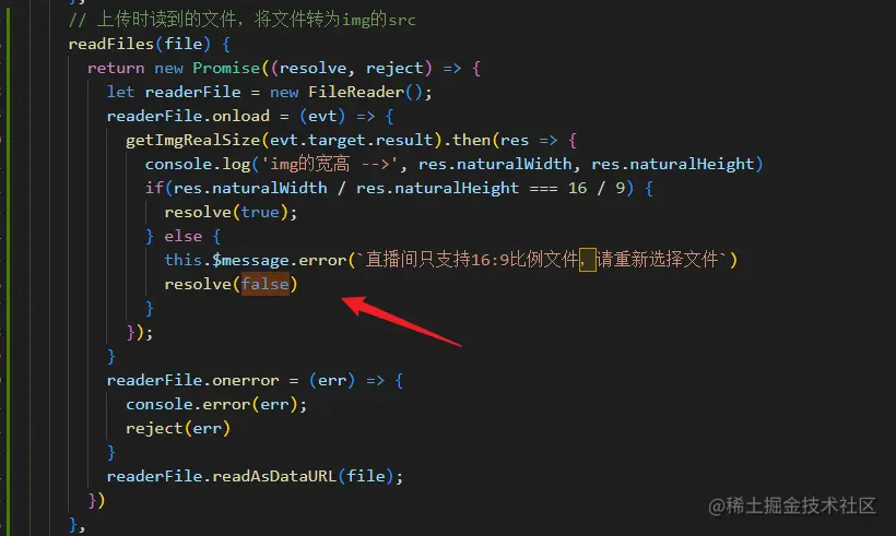 那显然改了beforeAvatarUpload方法还不够,还需要改readFiles方法,因为这里resolve(false)显然不能停止上传了,我们需要reject(false),不然就得在beforeAvatarUpload方法中继续判断,如果返回false就需要return为Promise.reject()