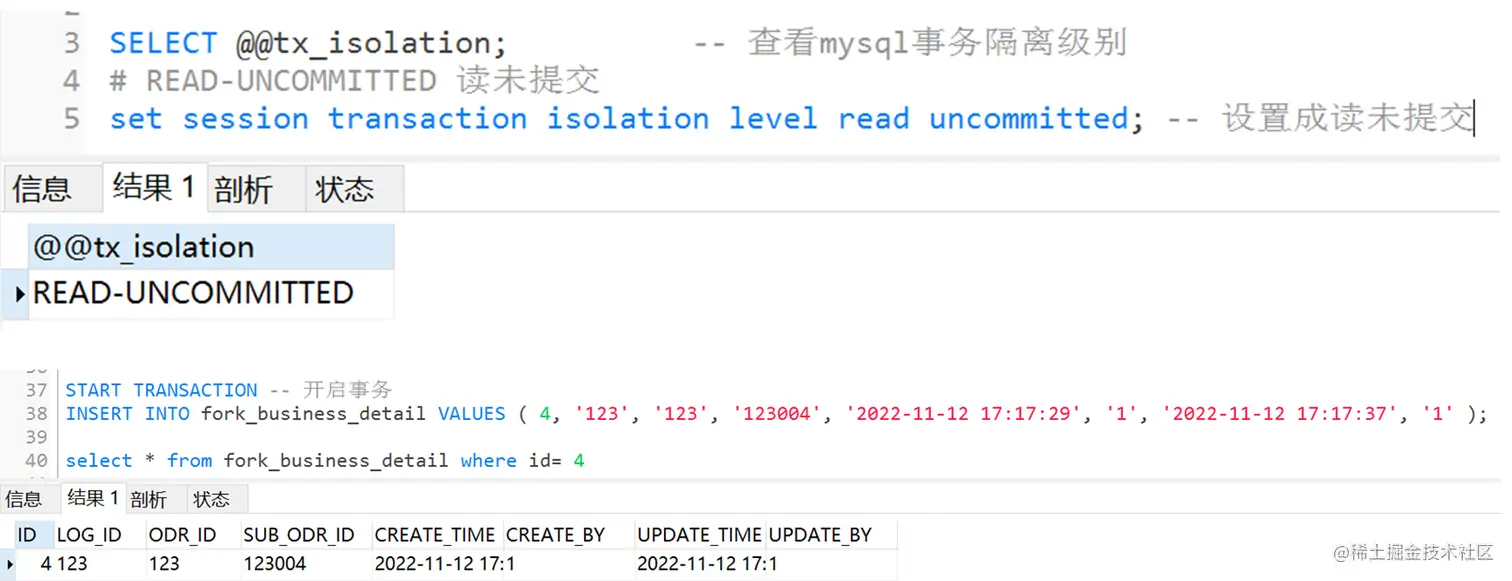 将事务隔离级别修改为读未提交,可以看到,事务还没有提交,这时候去查询这条数据,发现数据已经可见了。