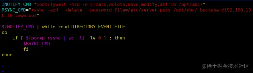 - 将inotify机制与rsync工具相结合,可以实现触发式备份(实时同步),即只要原始位置的文档发生变化,则立即启动增量备份操作;否则处于静默等待状态。