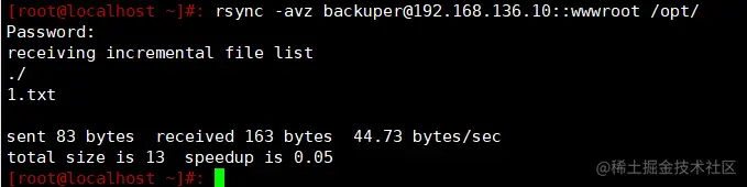 rsync -avz backuper@192.168.136.10::wwwroot /opt/ #wwwroot为共享模块名,密码abc123