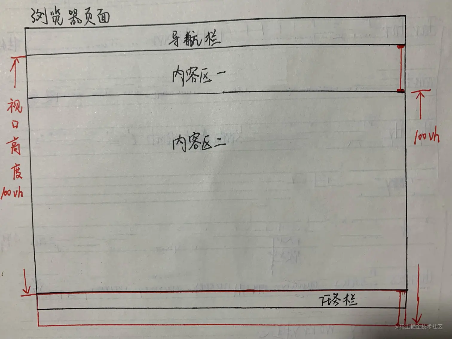 内容区一设置固定高度,内容区二设置100vh,当内容高度大于视图的时候就会有滚动条。滚动条拉到底的时候就出现了问题,如下图所示: