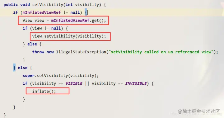 源码中使用mInflatedViewRef获取到view,然后设置隐藏与显示;mInflatedViewRef是一个view的弱引用WeakReference