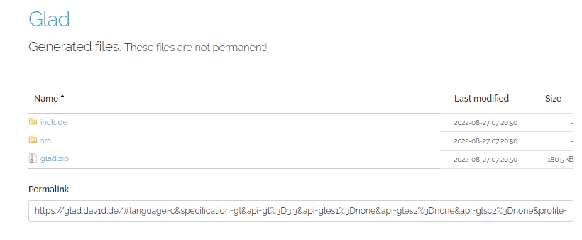 GLAD 是一个开源的库,它能解决我们上面提到的那个繁琐的问题。GLAD 的配置与大多数的开源库有些许的不同,GLAD 使用了一个在线服务。在这里我们能够告诉 GLAD 需要定义的 OpenGL 版本,并且根据这个版本加载所有相关的 OpenGL 函数。
