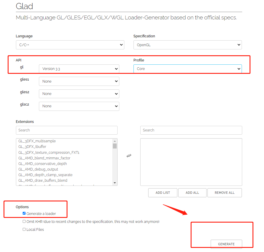 打开 GLAD 的在线服务,将语言(Language)设置为 C / C++,在 API 选项中,选择3.3 以上的 OpenGL(gl) 版本(我们的教程中将使用 3.3 版本,但更新的版本也能用)。之后将模式 (Profile) 设置为 Core,并且保证选中了生成加载器(Generate a loader) 选项。现在可以先(暂时)忽略扩展(Extensions)中的内容。都选择完之后,点击生成 (Generate) 按钮来生成库文件。