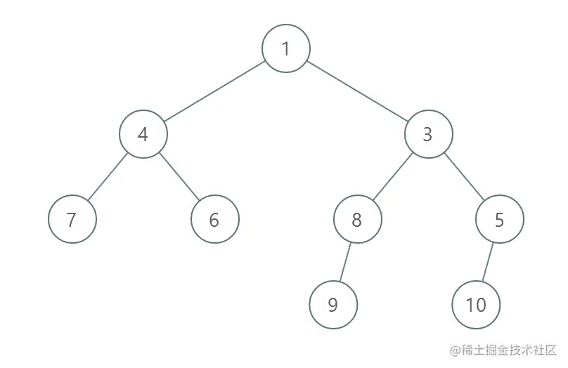 输入: root = [1,4,3,7,6,8,5,null,null,null,null,9,null,10]