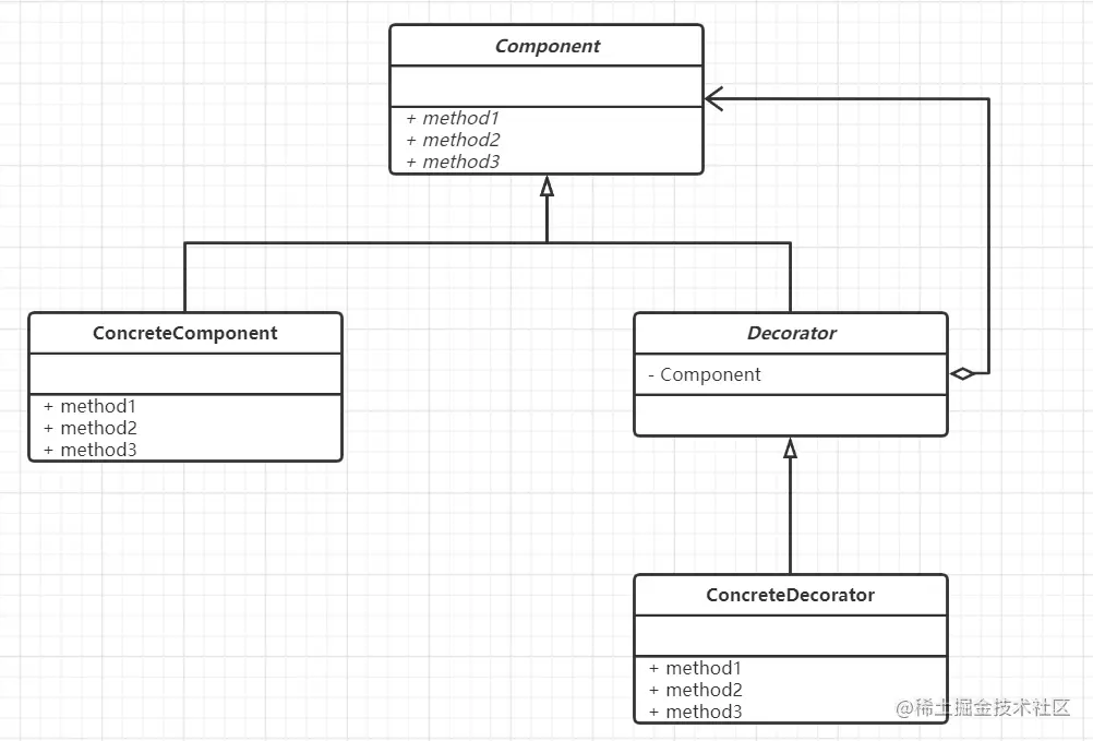 - 关键的一步就是把被装饰的对象聚合到装饰器中;