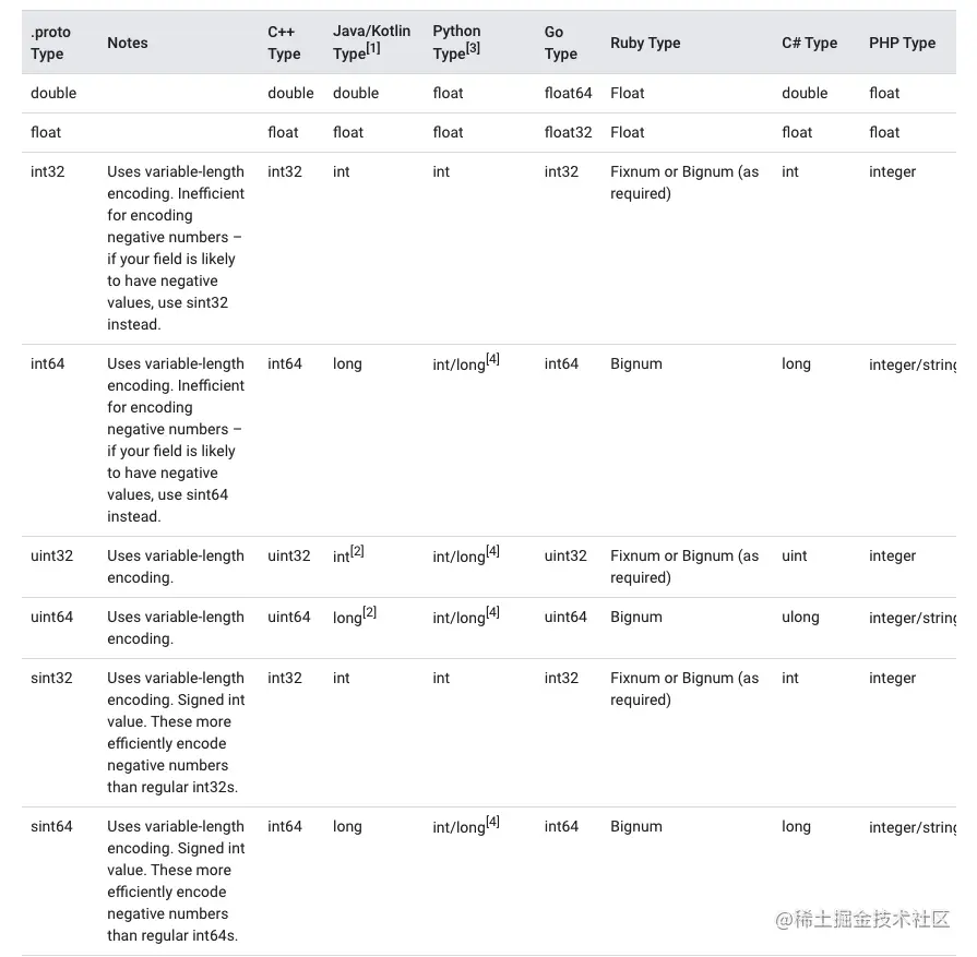 protobuf 定义了很多Value Types, 他和其他语言的映射关系如下: