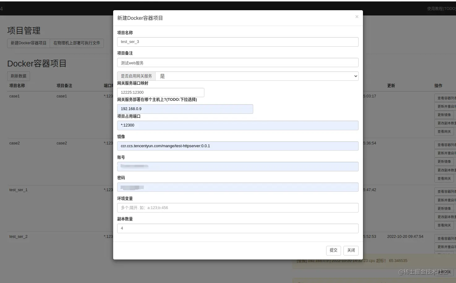 - 创建一个项目, 4个副本,会均匀部署到所有在线的Slave,web服务端口是12300, 创建一个网关代端口是12225部署到192.168.0.9上, 如下图: