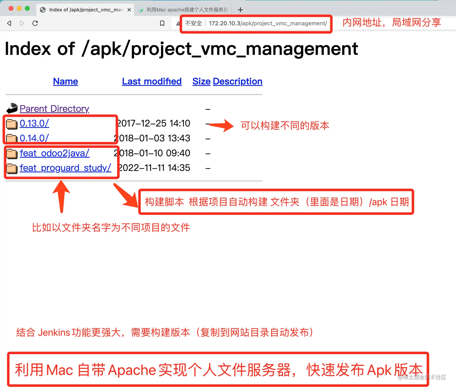 💐我们知道Mac自带了Apache服务器,可以方便将个人站点以及文件放到指定目录,实现内网用户分享,大部分mac用户并没有用到此功能,如果简单设置就能实现文件服务器分享、结合jenkins还可以实现自动化根据项目名称发布版本。