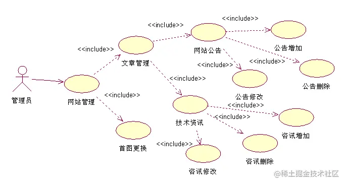 传统的UML用例图是用于描述角色和行为之间的关系,用例下面可以再拆分用例(或者叫进一步用例),类似这种: