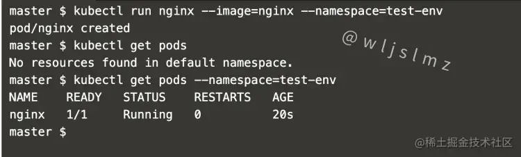 kubectl run nginx --image=nginx --namespace=test-env #尝试在不存在的命名空间中创建一个pod。