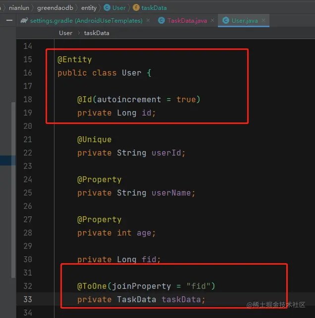 关于ToOne 的注解使用, 使用自定义的fid做关联,主表User中关联一个TaskData.是用户关联一个单一下载任务类。