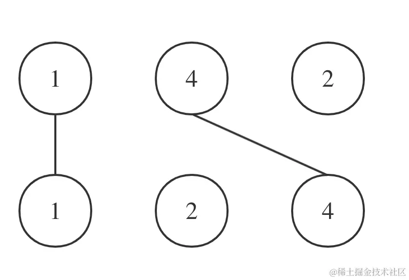 拿示例一A = [1,4,2], B = [1,2,4]为例,相交情况如图: