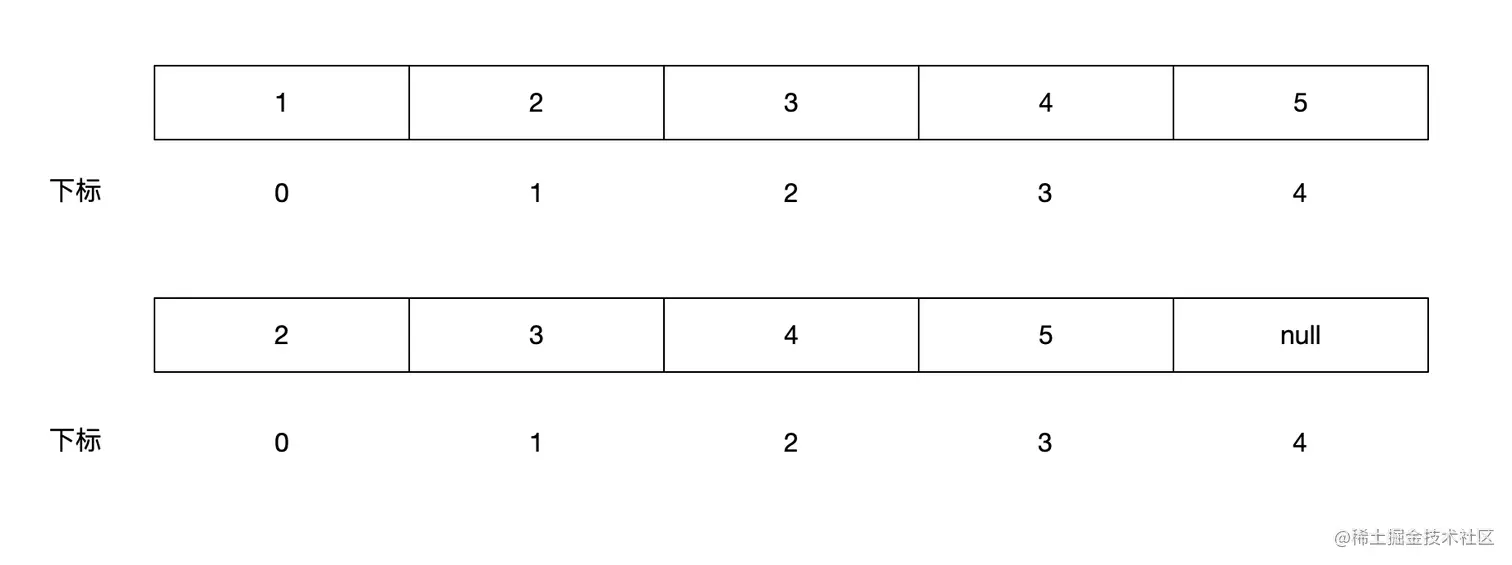 当删除数组元素时也需要开辟内存进行元素复制,删除某一个元素后,把后面的元素都往前挪一格。