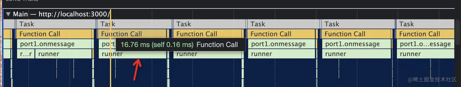 你有审查元素吗?项目背景图是通过 canvas 绘制的,并不是背景图片!通过 canvas 绘制如此多的小圆点,会不会阻碍页面操作呢?当数据量足够大的时候,是会阻碍的,大家可以把 NodeMargin 设置为 0.1 ,同时把 schduler 调用去掉,直接改为同步绘制。当节点数量在 500 W 的时候,如果没有开启切片,页面白屏时间在 MacBook Pro M1 上白屏时间大概是 8.5 S;开启分片渲染时页面不会出现白屏,而是从左到右逐步绘制背景图,每个任务的执行时间在 16S 左右波动。