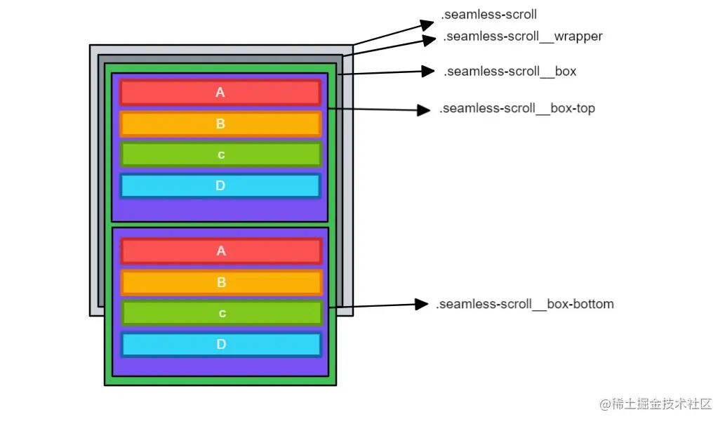 .seamless-scroll__wrapper:具备position: relative和宽高100%的元素,目的是充满父元素。之所以采用这种冗余的布局方式,是为了满足更多场景的使用,比如