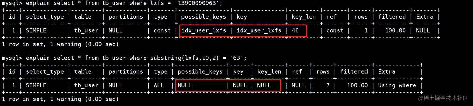 mysql> explain select * from tb_user where lxfs = '13900090963';
