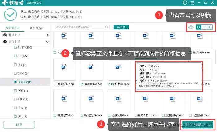步骤3:找到你要的文档并选择。比如,选择word文档所在的文件类型,找到要恢复的文档后。鼠标可以放置在word文档的上方,就可以看到文件的详细信息。想要不同的切换方式,可以点击不同的切换视图来查看,根据你的需要选择即可。选择文档后,点击【恢复】。