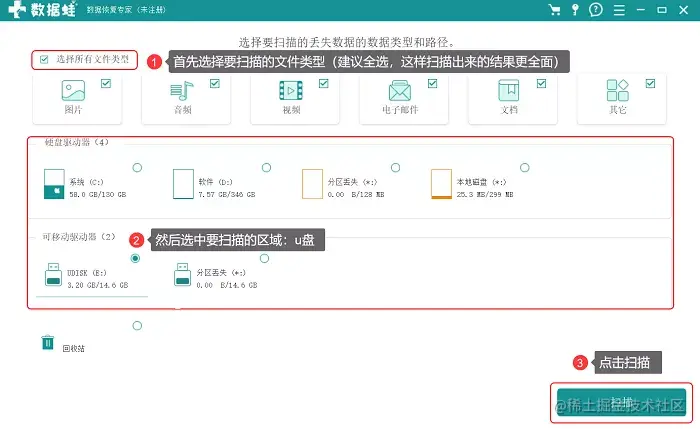步骤1:在打开的首页上,首选选择要恢复的文件类型:图片、文件、视频、音频等,然后选择要扫描的区域:u盘。最后,点击页面的【扫描】按钮。